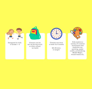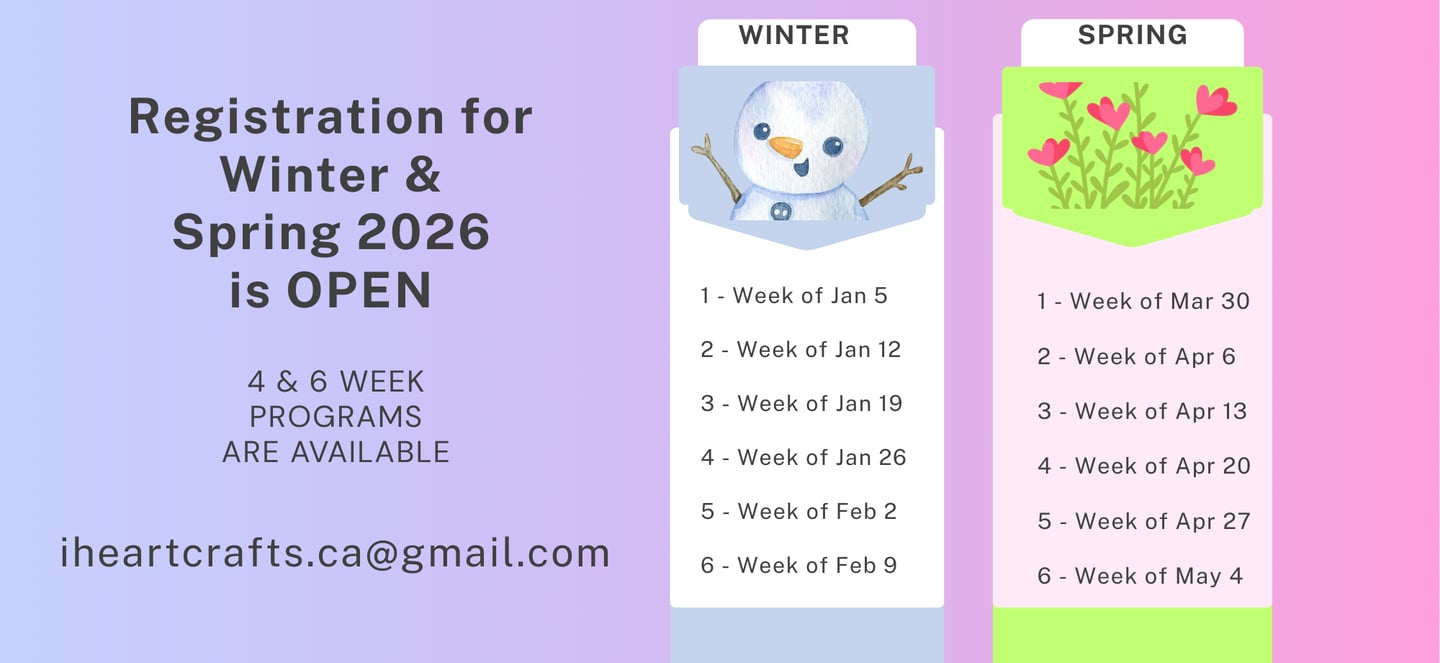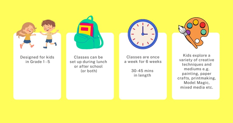 At iHeartCrafts, we deliver hands-on arts and crafts programs for students in Grades 1–5. Each session is designed to spark imagination, build confidence, and give students a fun creative outlet during or after the school day.
