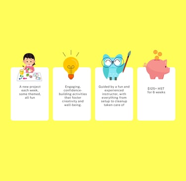 Our programs run as weekly sessions (30-45 minutes each), offered in 4-6-week cohorts. This format gives students the opportunity to explore new techniques, practice skills, and proudly create projects they can take home.